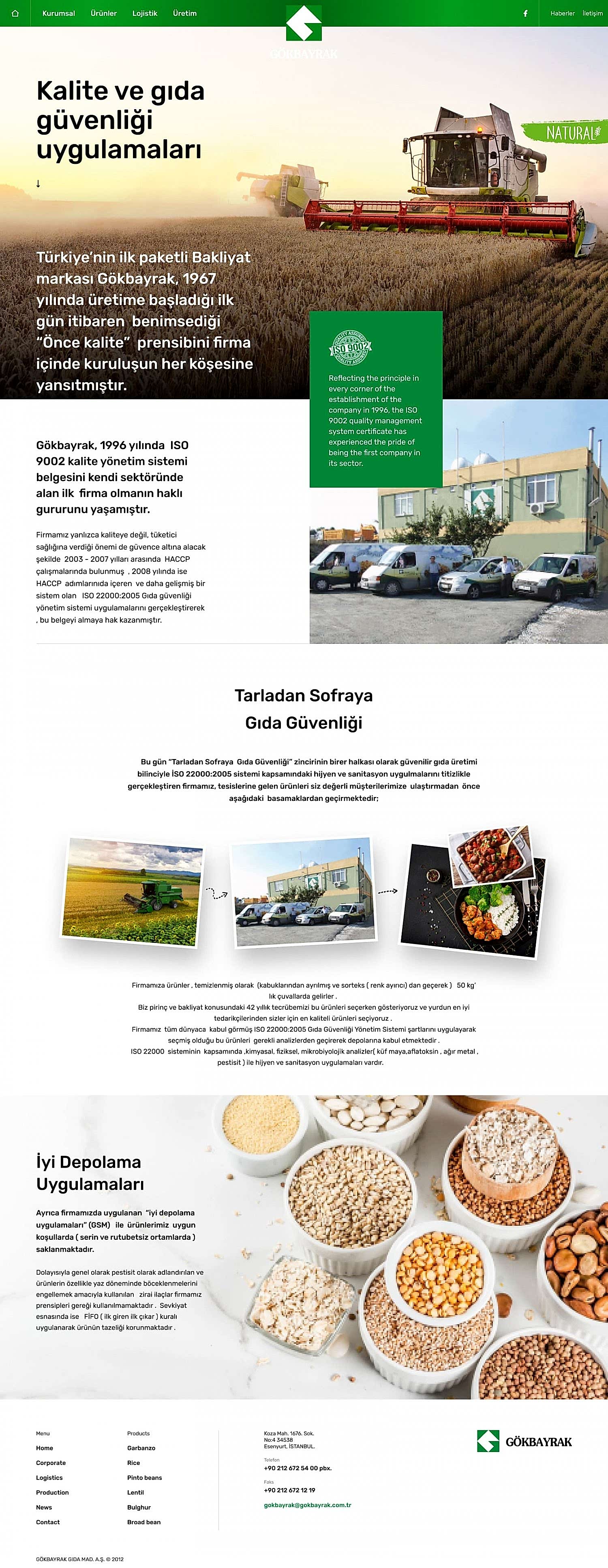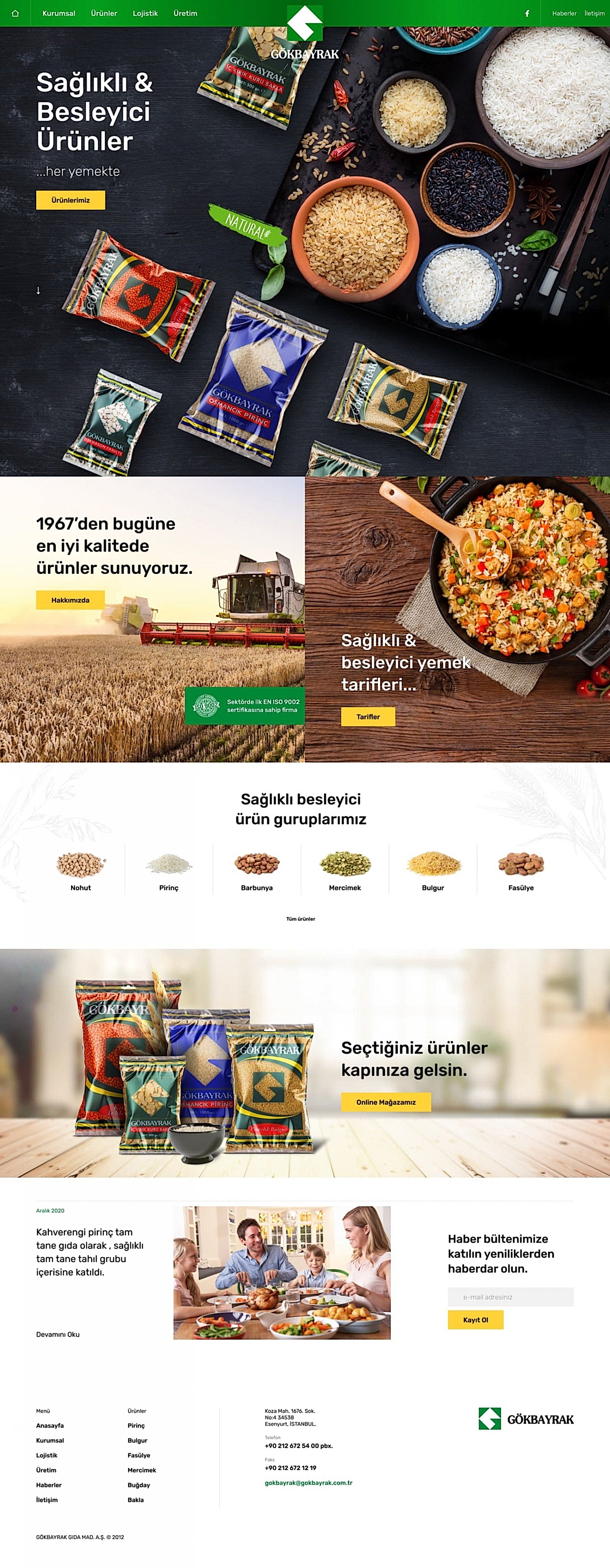 Gıda ve bakliyat sektöründe öncü markalardan birisi olan "Gökbayrak" Gıda web tasarımı için ofisimize başvurdu. Sektörde yaptığımız araştırmalar sonucunda, yüksek kalitede bir gıda web sitesi tasarımı için kendimize bir yol planı çizdik. Planımızın ana hatlarında ürünleri estetik açıdan ele alan, renk bütünlüğü sağlanmış, kullanışlı ve etkileyici bir site oluşturmak vardı. Hemen harekete geçerek sayfa düzenini optimal şekilde ayarladık ve iyi kalitede görsellerle müşteri etkileşiminin artmasını sağladık.