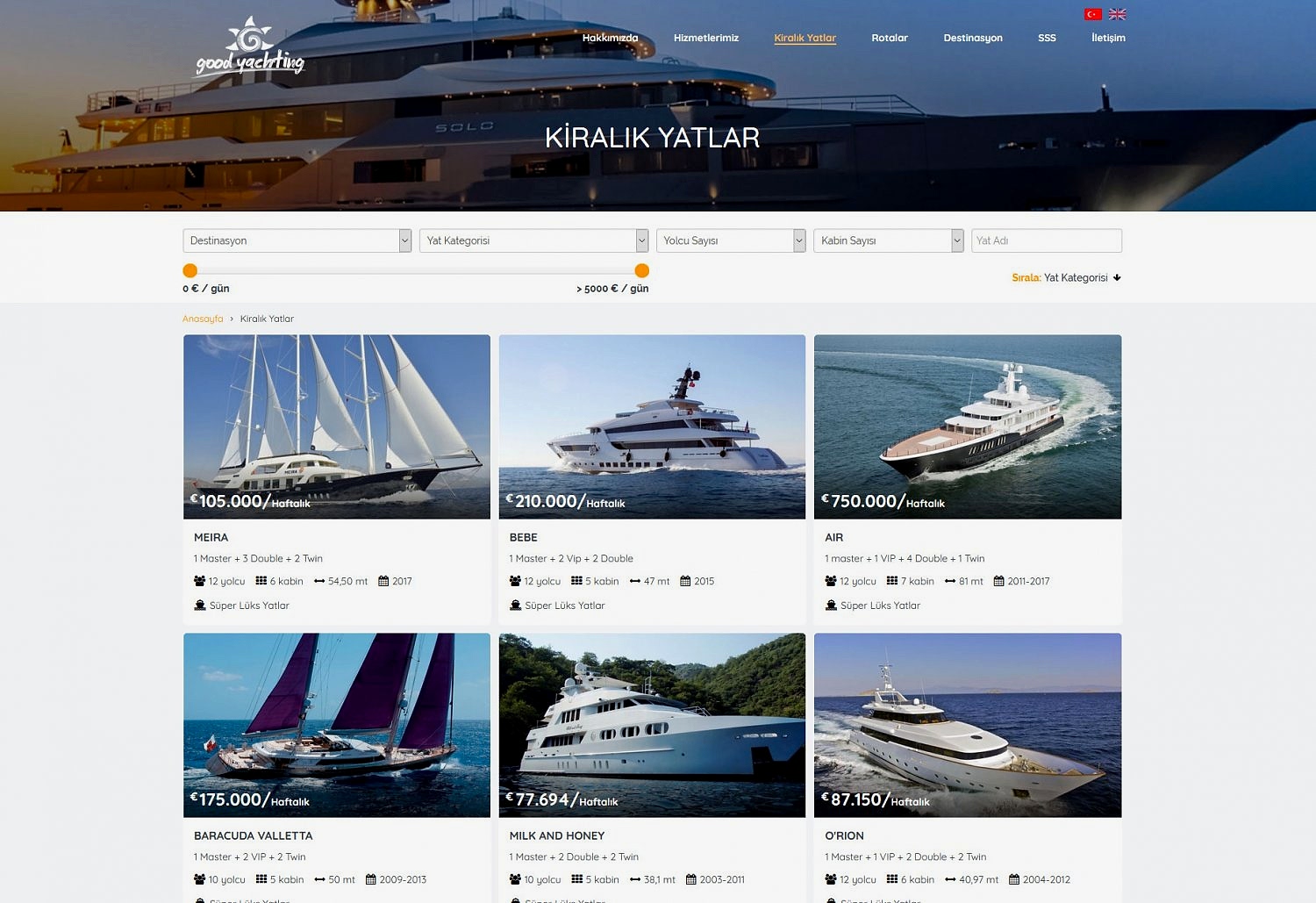 Ülkemiz de dahil olmak üzere pek çok ülkede hizmet veren Good Yachting gezi ve yat kiralama firması, profesyonel bir web tasarım ajansı tarafından hazırlanmış bir projeye ihtiyaç duyuyordu. Bizler de özel bir yatçılık web sitesi oluşturmak, lüks ve konforlu yatları ön plana çıkarmak için ekibimizle kendimize bir yol planı hazırladık. Öncelikle, sitenin hem masaüstü hem de mobil versiyonlarını geliştirerek Responsive bir tasarım oluşturduk. Ardından, ana sayfaya firmanın sunduğu hizmetleri yatların etkileyici görselleriyle birlikte ekledik. Sonrasında siteye prestij katacak kurumsal yazıları ve müşterileri etkileyecek pazarlama metinlerini ilave ettik. En sonunda ise firmanın görev yerlerine göre tasarımımızı tam 4 ayrı dile entegre ederek oldukça başarılı bir web site inşasını daha tamamladık.